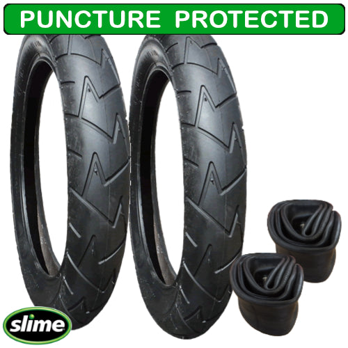 Protect against punctures with this set of tyres and inner tubes. The inner tubes are filled with Genuine Slime Tube Sealant which seeks out and instantly seals punctures in your inner tubes, working continuously for up to 2 years.
